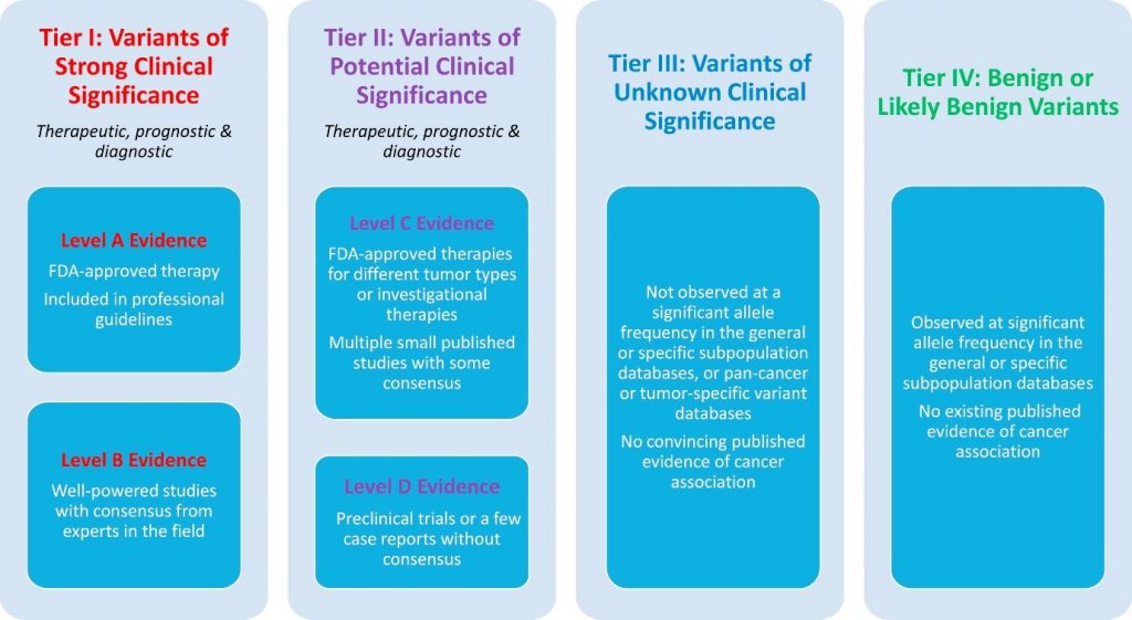 Level A Biomarkers that predict response or resistance to FDA-approved therapies for a specific type of tumor Biomarkers included in professional guidelines as diagnostic for a specific type of tumor Biomarkers included in professional guidelines as prognostic for a specific type of tumor