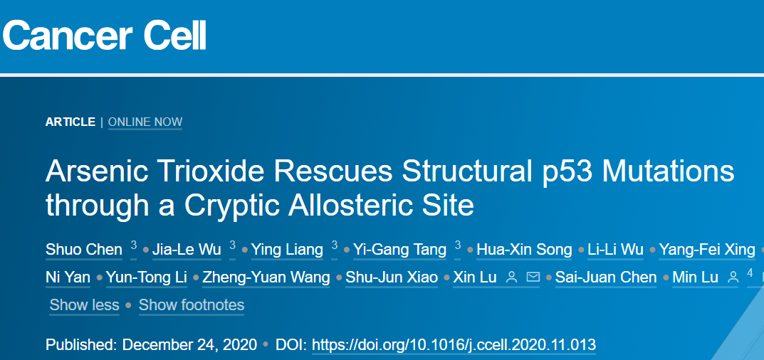 2020年12月24日,基因解碼科學(xué)家實(shí)現(xiàn)了突破,在 Cancer Cell雜志上發(fā)表了文章 Arsenic Trioxide Rescues Structural p53 Mutations through a Cryptic Allosteric Site,提出了針對(duì)抑癌蛋白設(shè)計(jì)和尋找靶向藥物的理論,并根據(jù)此理論,觀察并解釋老化合物三氧化二砷(ATO)可以恢復(fù)部分基因突變導(dǎo)致的P53蛋白缺陷,在國(guó)際上提出了根據(jù)抑癌蛋白腫瘤基因設(shè)計(jì)和選擇靶向藥物的方法和案例。