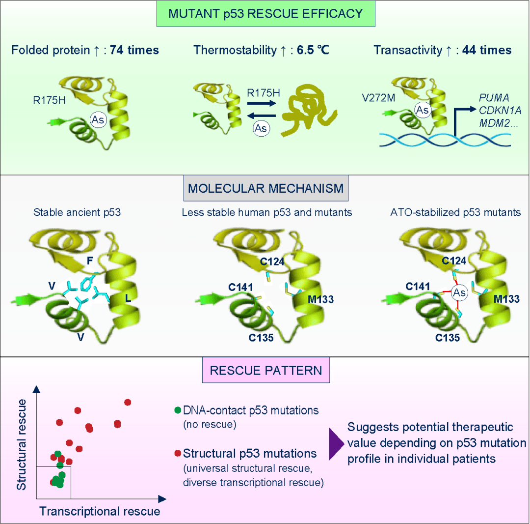 然而,總體而言,ATO在非APL白血病上的臨床緩解率低。發(fā)現(xiàn)APL特有的PML-RAR以外的ATO作用靶點(diǎn),正確選擇可能取得療效的病人,是實(shí)現(xiàn)ATO“老藥新用”的重要環(huán)節(jié)。近日,上海交通大學(xué)醫(yī)學(xué)院附屬瑞金醫(yī)院 盧敏研究員等發(fā)表在 Cancer Cell 上的工作揭示ATO可直接靶向結(jié)構(gòu)突變型p53,促使這一類(lèi)蛋白更容易折疊并恢復(fù)其抑癌功能。該研究顯示, 相比于已經(jīng)報(bào)道的p53靶向化合物低下或者難以檢測(cè)的p53復(fù)活效率,ATO在復(fù)活p53效率上具有一到多個(gè)數(shù)量級(jí)上的優(yōu)勢(shì),并具明確的p53突變適用譜,即誘導(dǎo)p53不折疊的那一類(lèi)“結(jié)構(gòu)型突變”。