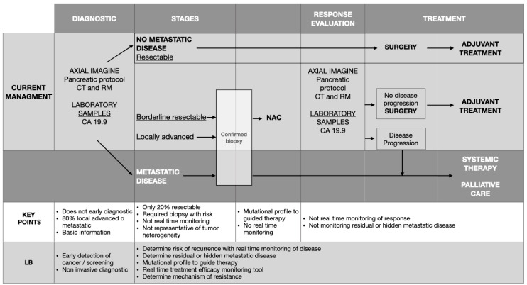 血清標(biāo)志物碳水化合物抗原19-9(CA19-9)和增強計算機(jī)斷層掃描(CT)是診斷和監(jiān)測反復(fù)的主要方法。然而,CA19-9在敏感性和特異性方面均存在局限性(約80%和約75%),并且并非僅限于胰腺癌。另一方面,CT掃描主要檢測宏觀疾病反復(fù),適用性有限。此外,使用實體活檢進(jìn)行組織學(xué)分析存在報告的局限性和風(fēng)險
