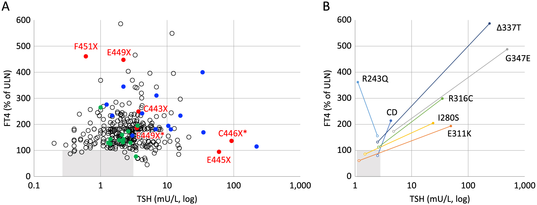 佳學基因甲狀腺激素抵抗全身性抵抗型基因檢測大數(shù)據(jù)分析的FT4值以各機構參考范圍上限的百分比表示。(A)通過人工智能數(shù)據(jù)分析及認知模型從案例中獲得了四種不同的單個氨基酸缺失(綠色圓圈),五種不同的早期終止密碼子(紅色圓圈)和六種不同的移碼突變(藍色圓圈),并與單個氨基酸缺失和單個氨基酸替代(開放圓圈)進行了比較,這些數(shù)據(jù)是從佳學基因的案例集中分析得來。FT4值以其對應的TSH先進值(對數(shù)尺度)繪制,參考范圍用灰色方塊表示。帶有星號的兩個截斷突變使用總T4值繪制。(B)通過人工智能認知模型獲得了RTHβ的同卵突變患者(實心圓圈),其中包括一種單個氨基酸缺失(Δ337T),五種不同的單個氨基酸替代和一種有效缺失(外顯子4-10),并與異卵突變患者(開放圓圈)進行了比較。CD表示有效缺失。