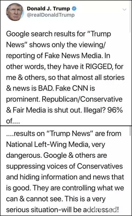 例如,2018年舉行的中期選舉時(shí),特朗普推特上發(fā)言稱「在谷歌上搜索特朗普新聞時(shí),出來(lái)的全是假新聞……谷歌和其他媒體都在壓制保守派的聲音,將正面新聞隱藏起來(lái)。這些科技公司正在控制人們可以看什么,不能看什么。」