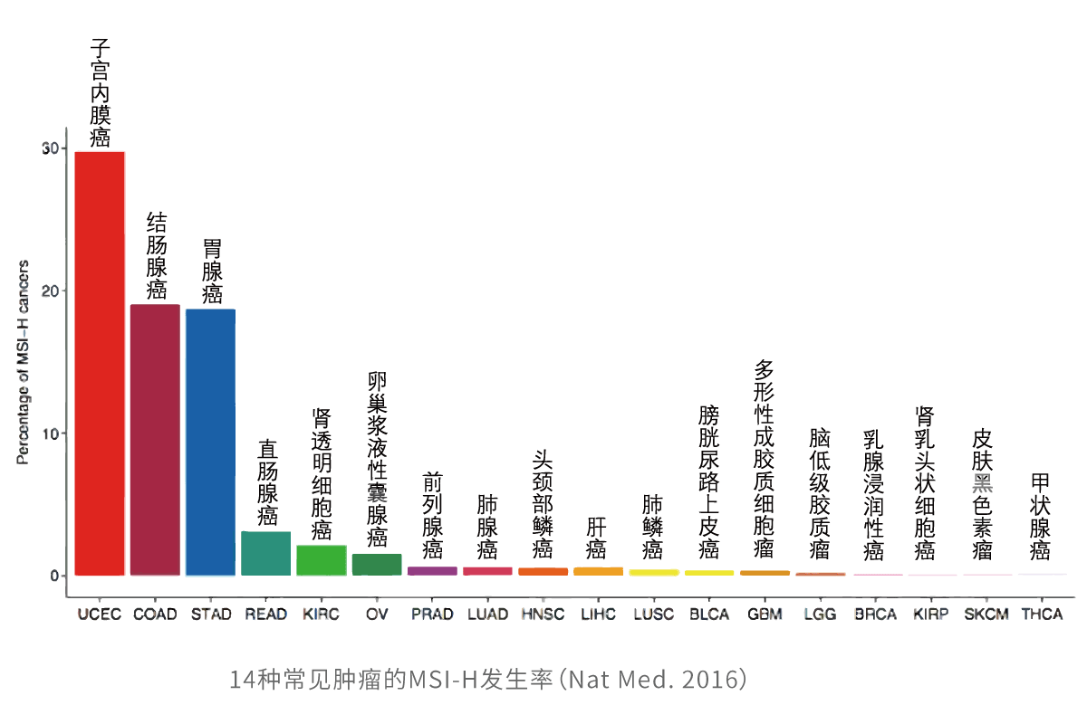 微衛(wèi)星(microsatellites)是遍布于人類基因組中的短串聯(lián)重復序列。與正常組織相比,腫瘤組織的微衛(wèi)星由于重復單位的插入或缺失而導致微衛(wèi)星長度的改變,就叫做微衛(wèi)星不穩(wěn)定性(Microsatellite Instability,MSI)。大量研究表明,MSI是由錯配修復(MMR)基因發(fā)生缺陷引起的,與腫瘤的發(fā)生密切相關。